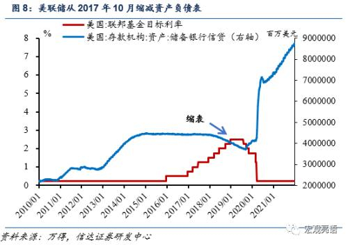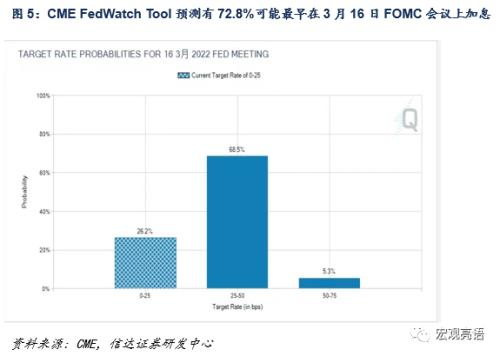 根据CME联邦基金期货合约价格预期,美联储在2022年3月有73.8%的概率会加息,美国2年期短期国债利率已经Price-In市场预期。回顾历史,2015年之后每次加息决议都是在相对重要的季末FOMC会议上做出的,因此我们预测,美联储可能会在2022年3月、6月和12月分别加息0.25%,首次加息的日期可能是2022年3月16日,此时Taper已经结束。加息周期内美联储也可能进行缩表,美联储理事沃勒曾表示,倾向于在夏季初之前开始,若需等待很长时间来缩表,将是出于收益率曲线方面的考虑,避免长端利率过快上行的金融风险;但同时美联储缩表也会避免利率曲线平坦化给经济带来的损坏[1]。