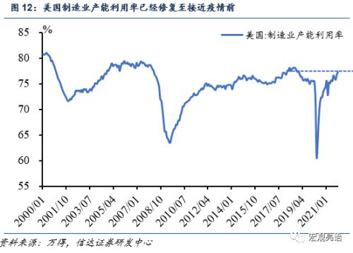 (一)交通运输(含私人运输以及二手车和卡车)贡献了CPI近一半的增长。受疫情反复和封锁,制造业生产运输不便叠加劳工短缺,导致生产中使用的半导体原件稀缺(半导体可以用来生产制造汽车、手机和家用电器所用的机电产品,也正是我国2021年出口美国的主要商品),导致成本抬升并需要从外国大量进口。新卡车的数量也随之减少,需要通过二手车和卡车(价格同比增长23.10%)对原材料和产成品进行运输,供不应求(图11)推升了整体通胀水平。当下美国的产能利用率已经修复至接近2018年77.4%的水平,说明主要是生产运输部分仍然存在问题。