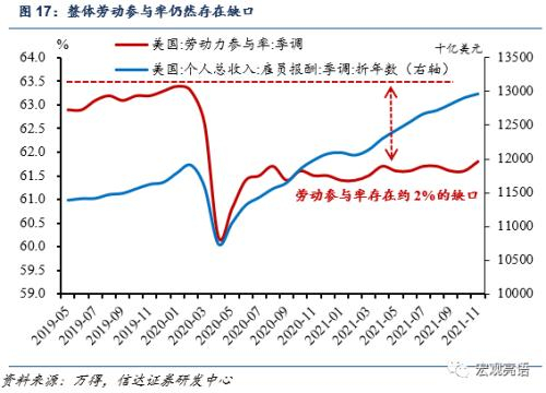 受疫情补助和对病毒感染的担忧,部分劳动力离开就业市场或提前退休,劳动力价格和工资螺旋式上升,从需求端贡献了美国当下的高通胀。我们认为就业数据大概会在2022年底前修复,但整体劳动参与率平均可能低于疫情前(部分原因是疫情改变了人们的工作态度,部分原因是工厂选择使用自动化生产来代替人工)。根据最新12月数据,美国的失业率3.9%,连续两个月分别下降0.4和0.3个百分点,说明数据在积极改善中。我们预期在2022,失业率会修复至3.5%,当下劳动参与率持续位于61.6%-61.9%区间,整体低于疫情前63.3%。