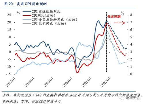 我们对贡献CPI的主要成因分析,假设交通运输9个月回落至正常水平,住宅项6个月回落,食品饮料作为扰动项存在不稳定性,大致也需要6个月回落,得到美国CPI会在2022年年底回归至2.4%左右。