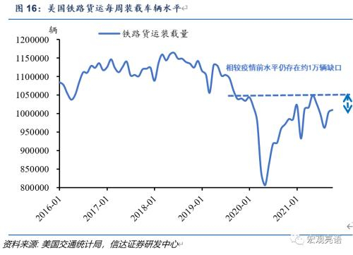 我们认为交通运输问题会在2022年下半年逐步消退,大概需要9-12个月的时间,虽然疫情零星反复存在不确定性,但再次全面爆发的可能性较小。如图1是杜克大学CFO调查问卷展示的美国当下成本端高企的原因,首要的问题是招工难和生产运输(供应链问题)。劳动力方面,74%的受访者表示他们在填补职位空缺方面遇到了困难,作为应对措施,其中82%的公司将它们的起薪平均提高了9.8%,同时也有33%的公司决定实施自动化的方式来取代工人以缓解困难。生产运输方面,只有10%的受访者认为问题将会在今年年底前得到解决,而大部分的人预计问题可能在2022年下半年甚至更晚才会好转。由美国交通运输部公布的数据,截至2021年10月,铁路每周铁路货运装载量仍存在的缺口,考虑其恢复的平均速度和波动性,乐观情形下,预计仍需大约半年的时间才能完全修复至疫情前。
