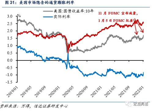 美国10年期TIPS通货膨胀债券(市场交易出来的真实利率)反映出了当下市场隐含通货膨胀率在2.53%左右。11月美联储FOMC会议和美联储1月5日FOMC纪要宣布前,10年期国债利率受避险情绪皆有冲高,在会议宣布后回落。真实利率水平是美国10年期TIPS交易出来的利率,隐含着经济增长预期,截止1月6日,在过去30天内,真实利率已从-1.07%持续增长到-0.82%,10年期国国债水平整体增长19.83%。美债10年期国债利率包含实际自然利率、通货膨胀预期和期限溢价。通胀预期往往在紧缩政策宣布时降温,即达到市场高点掉头向下,抵消了部分加息带来的期限溢价的增长。