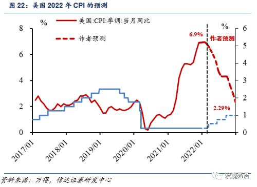 历史上美国加息对通胀水平有极大影响,CPI和联邦基金利率存在负相关关系,但是CPI的变动往往存在滞后性,一般在政策持续收紧一段时间后,CPI才出现回落。我们观察2016年和2018年美国两轮紧缩周期,除去基数效应干扰较大的时间段,利率水平整体每抬高0.25个百分点,CPI会下降0.5-1个百分点。然而历史不会完全相同,本次高通胀水平原因不同于此前金融危机后无限量量化宽松,更是由于大规模疫情下产业链修复困难所致。我们预测CPI会大概会在2022年底回归至2.3%左右。