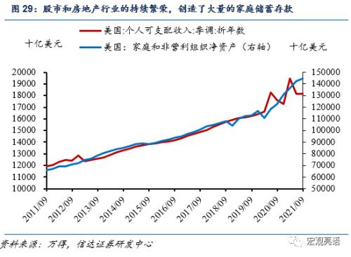 本次疫情过后,股市和房地产市场的繁荣,创造约2.6万亿美元的家庭财富。虽然个人可支配收入(主要包括工资和副业等劳动收入、养老金和退休金以及政策补贴)已经回落,但是整体居民家庭财富大幅增长,侧面抬高了居民整体的消费潜力。