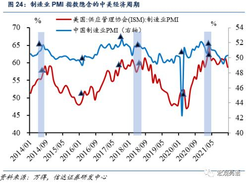 此轮疫情后,我国于2020年3月率先于美国复苏,经济复苏起点领先美国(2020年7月)一个季度;经济景气度PMI在2021年11月首次见顶,早于美国(2022年3月见顶)四个月,顺理成章地,我国货币和信贷政策也提前进入了一轮紧缩周期。但是,我国由于第三季度:地产下行、疫情反复、洪水灾害,叠加限产限电等一系列政策影响,整体经济在2021年第三季度承压,政策积极纠偏在四季度相应宽松以支持实体经济;与此同时,美国2022年上半年经济修复强劲,但美联储出于就业疲软迟迟未收紧货币政策,导致美国从第三季度起出现高通胀苗头,当下通胀恶化美联储不得不急速Taper并提前加息收紧,以防通胀恶化对经济产生负面效用。两国经济周期修复的不同步,以及政策调控节奏的不一致,为当下两国货币政策分化埋下伏笔。