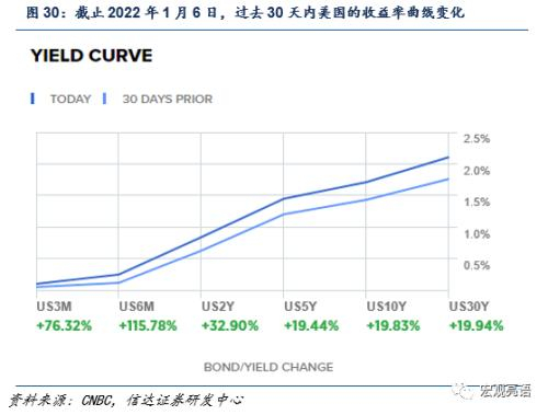 短端利率受加息政策影响较大,当下已Price-In 加息三次的政策利率。截止2022年1月6日,过去30天2年期国债利率增长32.90%,录得0.83%的水平。短端2年期国债利率增长幅度大,10年期国债利率增长幅度小,随着加息预期抬升,整体利率曲线2-10年期段形态呈现平缓(yield curve flattening,见图33)。