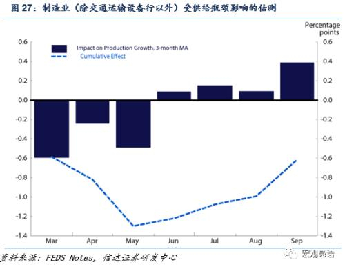 图27展示,供应链问题每月对于整体产出的拖累,折线图则表示累计拖累。根据模型估算,供给瓶颈从年初到5月持续对产出造成影响,6月开始出现缓和迹象。截止9月,制造业产出的累积增长率仍然比正常情况下低 0.6个百分点。