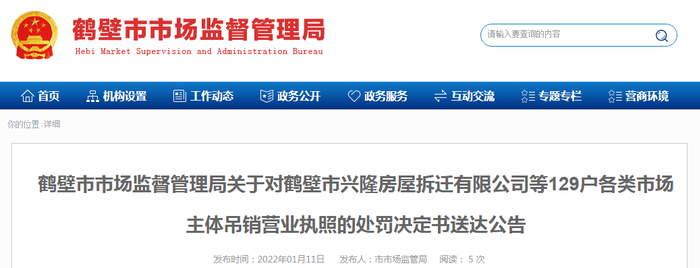鹤壁市市场监督管理局关于对鹤壁市兴隆房屋拆迁有限公司等129户各类市场主体吊销营业执照的处罚决定书送达公告