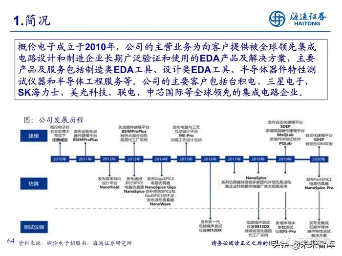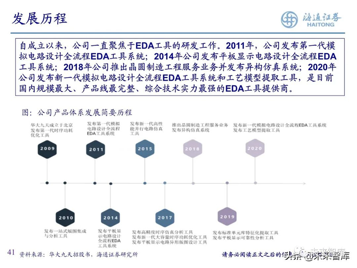 自成立以来,公司一直聚焦于EDA工具的研发工作。2011年,公司发布第一代模 拟电路设计全流程EDA工具系统;2014年公司发布平板显示电路设计全流程EDA 工具系统;2018年公司推出晶圆制造工程服务业务并发布异构仿真系统;2020年 公司发布新一代模拟电路设计全流程EDA工具系统和工艺模型提取工具,是目前 国内规模最大、产品线最完整、综合技术实力最强的EDA工具提供商。