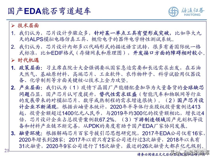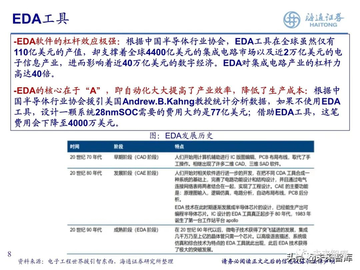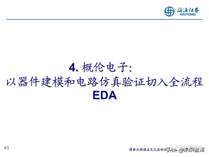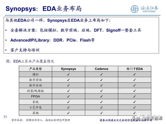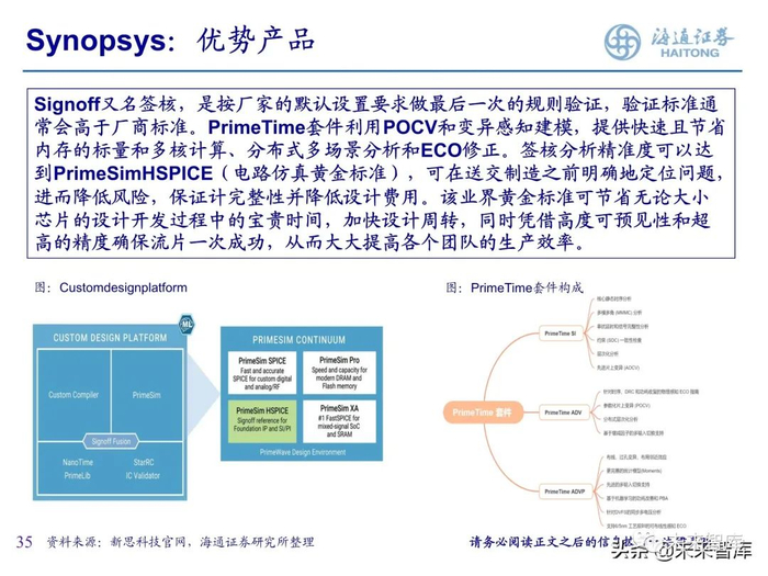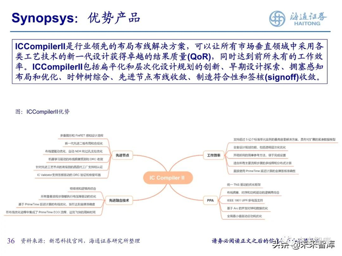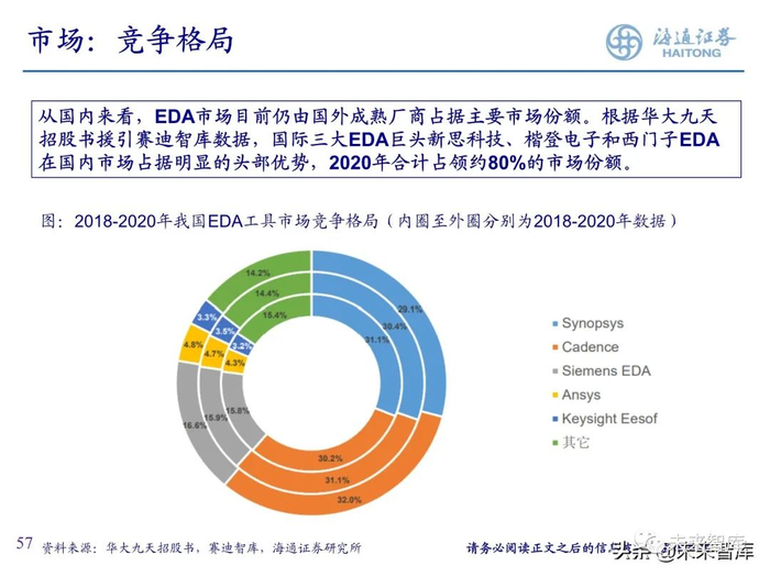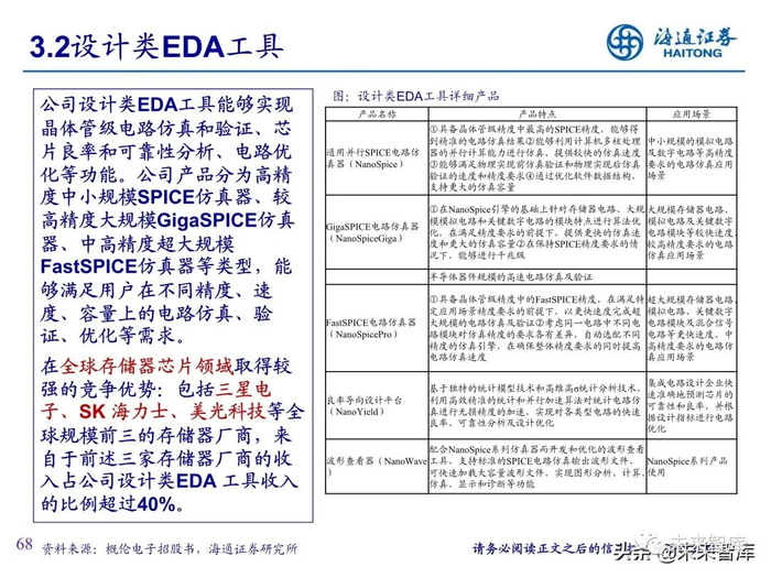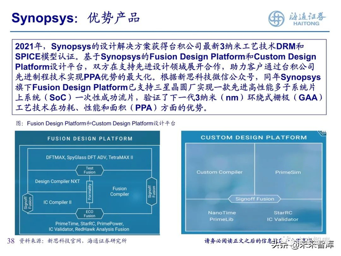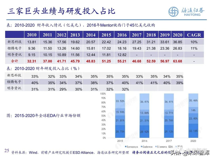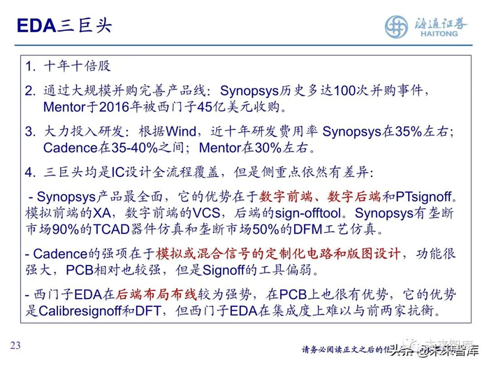 1. 十年十倍股 2. 通过大规模并购完善产品线:Synopsys历史多达100次并购事件, Mentor于2016年被西门子45亿美元收购。3. 大力投入研发:近十年研发费用率 Synopsys在35%左右;Cadence在35-40%之间;Mentor在30%左右。4. 三巨头均是IC设计全流程覆盖,但是侧重点依然有差异:- Synopsys产品最全面,它的优势在于数字前端、数字后端和PTsignoff。模拟前端的XA,数字前端的VCS,后端的sign-offtool。Synopsys有垄断 市场90%的TCAD器件仿真和垄断市场50%的DFM工艺仿真。- Cadence的强项在于模拟或混合信号的定制化电路和版图设计,功能很 强大,PCB相对也较强,但是Signoff的工具偏弱。- 西门子EDA在后端布局布线较为强势,在PCB上也很有优势,它的优势 是Calibresignoff和DFT,但西门子EDA在集成度上难以与前两家抗衡。(报告来源:未来智库)
