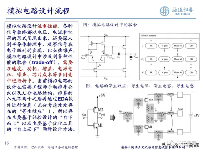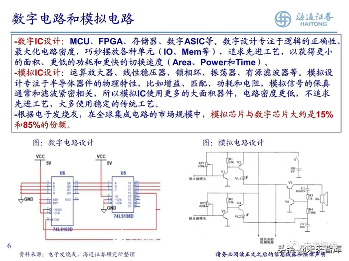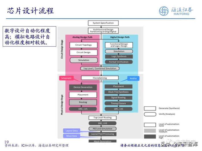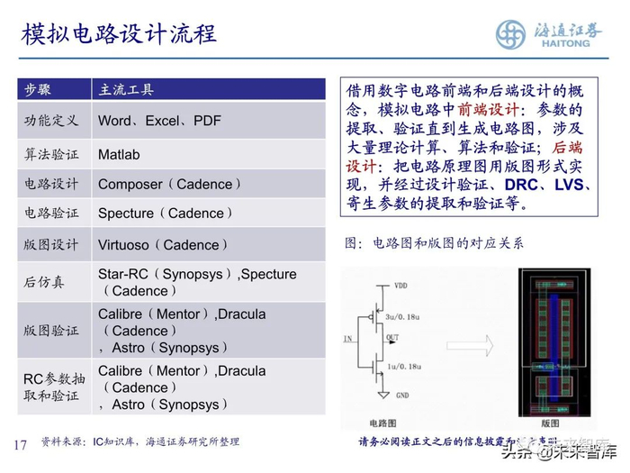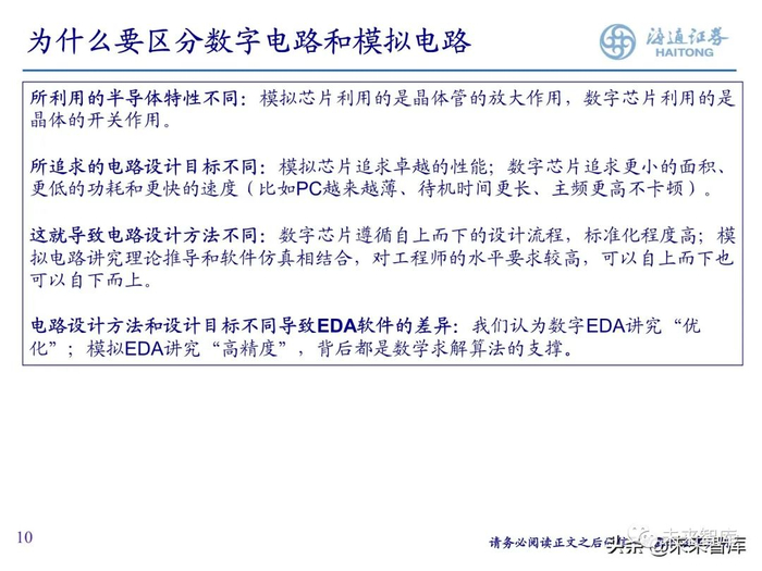 所利用的半导体特性不同:模拟芯片利用的是晶体管的放大作用,数字芯片利用的是 晶体的开关作用。所追求的电路设计目标不同:模拟芯片追求卓越的性能;数字芯片追求更小的面积、 更低的功耗和更快的速度(比如PC越来越薄、待机时间更长、主频更高不卡顿)。这就导致电路设计方法不同:数字芯片遵循自上而下的设计流程,标准化程度高;模 拟电路讲究理论推导和软件仿真相结合,对工程师的水平要求较高,可以自上而下也 可以自下而上。电路设计方法和设计目标不同导致EDA软件的差异:我们认为数字EDA讲究“优 化”;模拟EDA讲究“高精度”,背后都是数学求解算法的支撑。