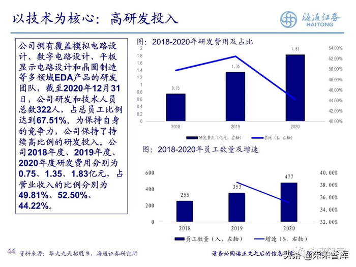 公司拥有覆盖模拟电路设 计、数字电路设计、平板 显示电路设计和晶圆制造 等多领域EDA产品的研发 团队,截至2020年12月31 日,公司研发和技术人员 总数322人,占总员工比例 达到67.51%。为保持自身 的竞争力,公司保持了持 续高比例的研发投入。公 司2018年度、2019年度、 2020年度研发费用分别为 0.75、1.35、1.83亿元,占 营业收入的比例分别为 49.81%、52.50%、 44.22%。