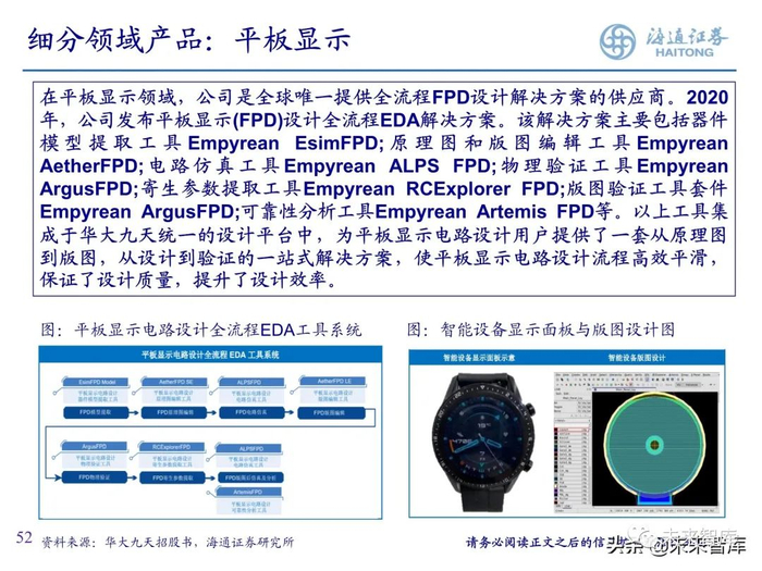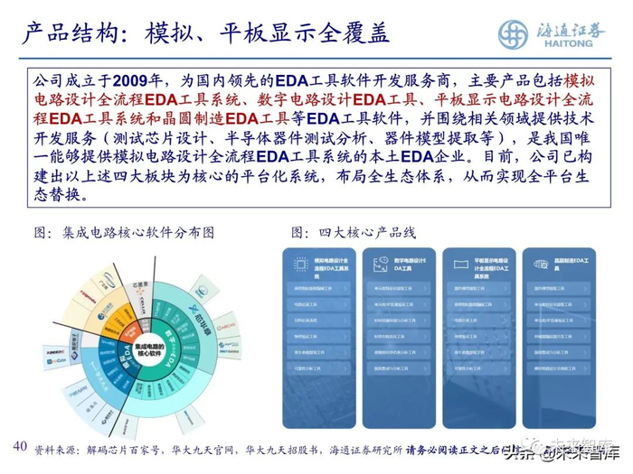 公司成立于2009年,为国内领先的EDA工具软件开发服务商,主要产品包括模拟 电路设计全流程EDA工具系统、数字电路设计EDA工具、平板显示电路设计全流 程EDA工具系统和晶圆制造EDA工具等EDA工具软件,并围绕相关领域提供技术 开发服务(测试芯片设计、半导体器件测试分析、器件模型提取等),是我国唯 一能够提供模拟电路设计全流程EDA工具系统的本土EDA企业。目前,公司已构 建出以上述四大板块为核心的平台化系统,布局全生态体系,从而实现全平台生 态替换。