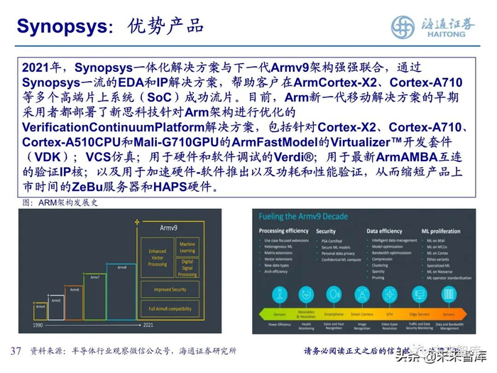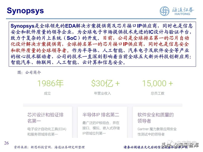 Synopsys是全球领先的EDA解决方案提供商及芯片接口IP供应商,同时也是信息 安全和软件质量的领导企业,为全球电子市场提供技术先进的IC设计与验证平台, 致力于复杂的片上系统(SoC)的开发。目前,公司是全球排名第一的芯片自动 化设计解决方案提供商,全球排名第一的芯片接口IP供应商,同时也是信息安全 和软件质量的全球领导者。作为半导体、人工智能、汽车电子及软件安全等产业 的核心技术驱动者,公司的技术一直深刻影响着当前全球五大新兴科技创新应用:智能汽车、物联网、人工智能、云计算和信息安全。