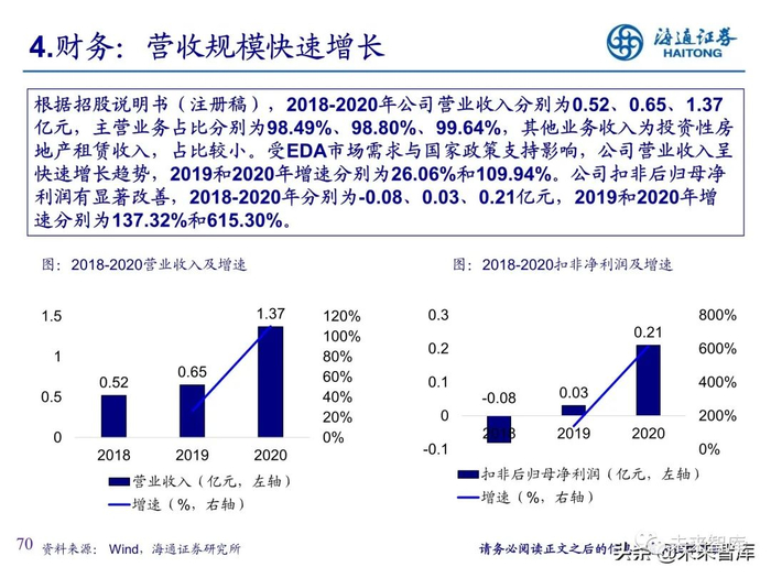 2018-2020年公司营业收入分别为0.52、0.65、1.37 亿元,主营业务占比分别为98.49%、98.80%、99.64%,其他业务收入为投资性房 地产租赁收入,占比较小。受EDA市场需求与国家政策支持影响,公司营业收入呈 快速增长趋势,2019和2020年增速分别为26.06%和109.94%。公司扣非后归母净 利润有显著改善,2018-2020年分别为-0.08、0.03、0.21亿元,2019和2020年增 速分别为137.32%和615.30%。
