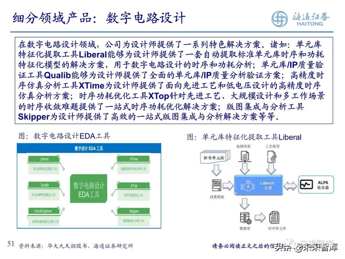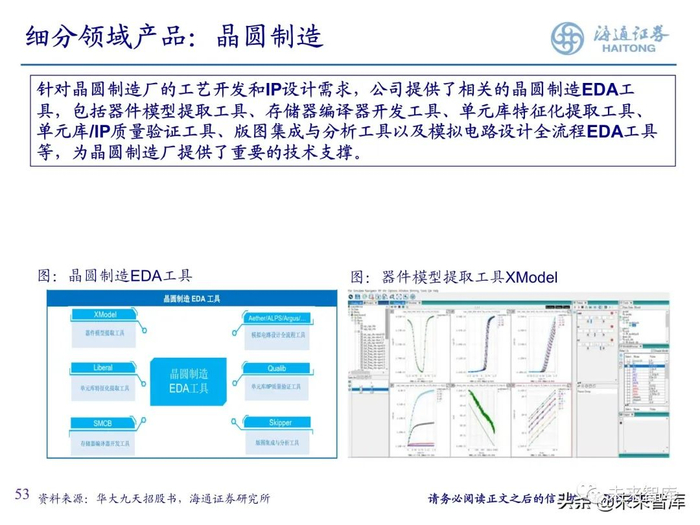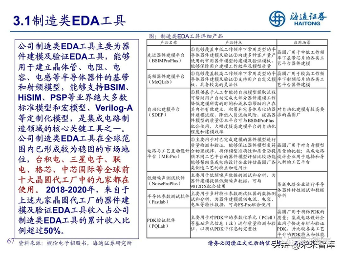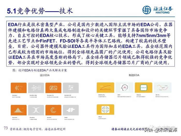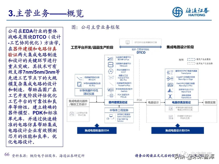 公司在EDA行业的整体 战略是围绕DTCO(设计 -工艺协同优化)方法学, 在器件建模和电路仿真 验证两大集成电路制造 和设计的关键环节进行 重点突破,其技术可有 效支撑7nm/5nm/3nm等 先进工艺节点下的大规 模复杂集成电路的设计 和制造,帮助晶圆厂在 工艺开发阶段评估优化 工艺平台的可靠性和良 率等特性,建立精确的 器件模型、PDK和标准 单元库,并通过快速精 准的电路仿真帮助集成 电路设计企业有效预测 芯片的性能和良率,优 化电路设计。