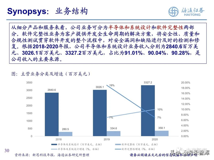 从细分产品和服务来看,公司业务可分为半导体和系统设计和软件完整性两部 分。软件完整性业务为客户提供开发全生命周期的解决方案,将安全性、质量和 合规性测试贯穿软件开发的整个流程中,对安全漏洞和缺陷进行及时的检测和修 复。