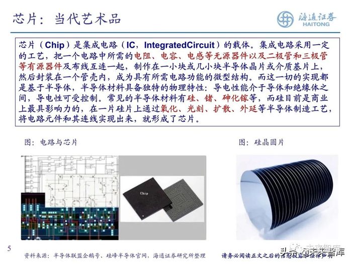 芯片(Chip)是集成电路(IC,IntegratedCircuit)的载体。集成电路采用一定 的工艺,把一个电路中所需的电阻、电容、电感等无源器件以及二极管和三极管 等有源器件及布线互连一起,制作在一小块或几小块半导体晶片或介质基片上, 然后封装在一个管壳内,成为具有所需电路功能的微型结构。而这一切的实现都 是基于半导体,半导体材料具备独特的物理特性:导电性能介于导体和绝缘体之 间,导电性可受控制。常见的半导体材料有硅、锗、砷化镓等,而硅目前是商业 上最具影响力的,在一片硅片上通过氧化、光刻、扩散、外延等半导体制造工艺, 将电路元件和其连线实现出来,就形成了芯片。
