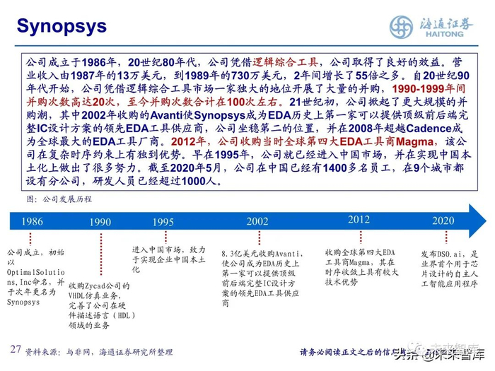 公司成立于1986年,20世纪80年代,公司凭借逻辑综合工具,公司取得了良好的效益。营 业收入由1987年的13万美元,到1989年的730万美元,2年间增长了55倍之多。自20世纪90 年代开始,公司凭借逻辑综合工具市场一家独大的地位开展了大量的并购,1990-1999年间 并购次数高达20次,至今并购次数合计在100次左右。21世纪初,公司掀起了更大规模的并 购潮,其中2002年收购的Avanti使Synopsys成为EDA历史上第一家可以提供顶级前后端完 整IC设计方案的领先EDA工具供应商,公司坐稳第二的位臵,并在2008年超越Cadence成 为全球最大的EDA工具厂商。2012年,公司收购当时全球第四大EDA工具商Magma,该公 司在复杂时序约束上有独到优势。早在1995年,公司就已经进入中国市场,并在实现中国本 土化上做出了很多努力。截至2020年5月,公司在中国已经有1400多名员工,在9个城市都 设有分公司,研发人员已经超过1000人。