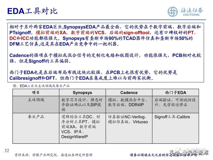 相对于另外两家EDA巨头,SynopsysEDA产品最全面,它的优势在于数字前端、数字后端和 PTsignoff。模拟前端的XA,数字前端的VCS,后端的sign-offtool,还有口碑极好的PT、 DC和ICC功能都很强大。Synopsys有垄断市场90%的TCAD器件仿真和垄断市场50%的 DFM工艺仿真,这是其在EDA产业竞争中的一把利器。Cadence的强项在于模拟或混合信号的定制化电路和版图设计,功能很强大,PCB相对也较 强,但是Signoff的工具偏弱。西门子EDA也是在后端布局布线这块比较强,在PCB上也很有优势,它的优势是 Calibresignoff和DFT,但西门子EDA在集成度上难以与前两家抗衡。