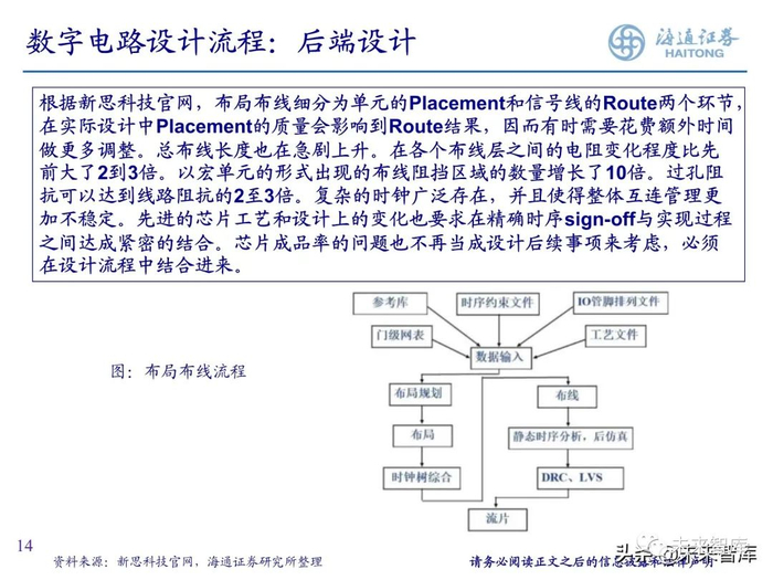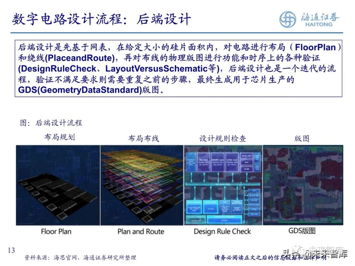后端设计是先基于网表,在给定大小的硅片面积内,对电路进行布局(FloorPlan) 和绕线(PlaceandRoute),再对布线的物理版图进行功能和时序上的各种验证 (DesignRuleCheck、LayoutVersusSchematic等),后端设计也是一个迭代的流 程,验证不满足要求则需要重复之前的步骤,最终生成用于芯片生产的 GDS(GeometryDataStandard)版图。