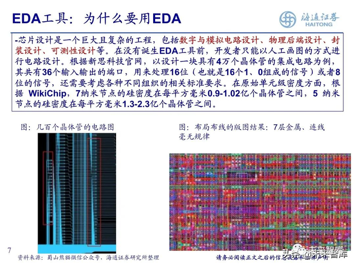 -芯片设计是一个巨大且复杂的工程,包括数字与模拟电路设计、物理后端设计、封 装设计、可测性设计等。在没有诞生EDA工具前,开发者只能以人工画图的方式进 行电路设计。以设计一块具有4万个晶体管的集成电路为例, 其共有36个输入输出的端口,用来处理16位(也就是16个1、0组成的信号)或者8 位的信号,还需要考虑各种不同组织的相关标准要求。在原始单元级密度方面,7纳米节点的硅密度在每平方毫米0.9-1.02亿个晶体管之间,5 纳米 节点的硅密度在每平方毫米1.3-2.3亿个晶体管之间。