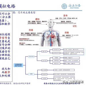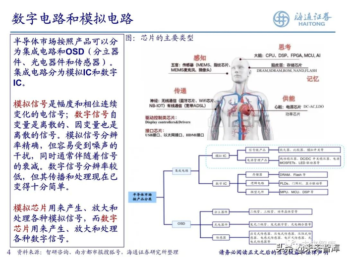 半导体市场按照产品可以分 为集成电路和OSD(分立器 件、光电器件和传感器)。集成电路分为模拟IC和数字 IC。模拟信号是幅度和相位连续 变化的电信号;数字信号自 变量是离散的、因变量也是 离散的信号。模拟信号分辨 率精确,但容易受到噪声的 干扰,同时通常伴随着信号 的衰减。数字信号分辨率较 低,但其传播和处理现在已 变得十分简单。模拟芯片用来产生、放大和 处理各种模拟信号,而数字 芯片用来产生、放大和处理 各种数字信号。