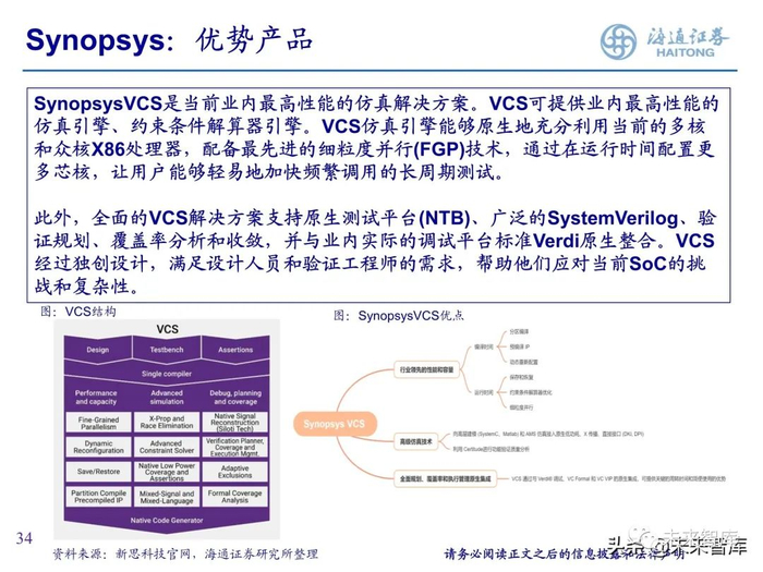 SynopsysVCS是当前业内最高性能的仿真解决方案。VCS可提供业内最高性能的 仿真引擎、约束条件解算器引擎。VCS仿真引擎能够原生地充分利用当前的多核 和众核X86处理器,配备最先进的细粒度并行(FGP)技术,通过在运行时间配臵更 多芯核,让用户能够轻易地加快频繁调用的长周期测试。此外,全面的VCS解决方案支持原生测试平台(NTB)、广泛的SystemVerilog、验 证规划、覆盖率分析和收敛,并与业内实际的调试平台标准Verdi原生整合。VCS 经过独创设计,满足设计人员和验证工程师的需求,帮助他们应对当前SoC的挑 战和复杂性。(报告来源:未来智库)