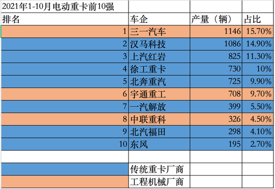 2021年上半年,上汽红岩与安徽、河北、山西、河南、贵州等地区的战略合作伙伴,签订近6000台新能源重卡的订单;11月28日,三一重卡与河北陆港保税物流公司签署了500辆新能源重卡的战略合作大单;同月,汉马科技与戎辉机械签订500辆纯电动重卡订单,并首批交付100辆。