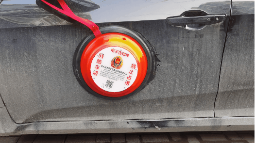 “红脸盆”是电子告知单的外号,源于它“脸盆”状的外形,此外,它外部还印有二维码与“消防车道 禁止占用”字样。