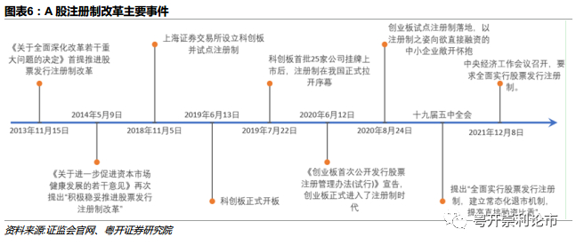 2013年11月15日,《关于全面深化改革若干重大问题的决定》发布,明确指出要完善金融市场体系,推进股票发行注册制改革,以取代现有的核准制。2014年5月9日国务院发布的《关于进一步促进资本市场健康发展的若干意见》(以下简称新“国九条”)再次提出“积极稳妥推进股票发行注册制改革”,注册制改革势在必行。2018年11月5日,国家领导人在进博会开幕式演讲中表示“将在上海证券交易所设立科创板并试点注册制”。2019年6月13日,科创板正式开板,7月22日科创板首批25家公司挂牌上市后,注册制在我国正式拉开序幕。2020年6月12日,证监会发布了《创业板首次公开发行股票注册管理办法(试行)》,宣告创业板正式进入了注册制时代,2020年8月24日,深圳证券交易所创业板改革并试点注册制首批企业上市仪式在深圳举行。2021年12月8日中央经济工作会议召开,提出全面实行股票发行注册制。