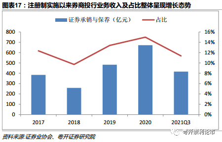 一,全面注册制直接利好券商。实施全面注册制将带来资本市场扩容,有望带来更多参与者,直接利好资本市场核心参与者券商。注册制实施以来,IPO项目显著增加,券商投行业务收入和占比整体增长。2019和2020年券商投行业务收入分别同比增长87%和39%,占行业总收入比重分别为13%和15%,增量收入贡献明显。目前券商板块估值为1.7倍市净率,处于近十年估值34%分位点,建议逢低关注优质券商标的股投资机会。