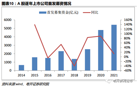 A股首发企业募集资金方面,2021年524家上市公司首发募集资金合计5,426.54亿元,同比增长13%,同样创下历史新高。