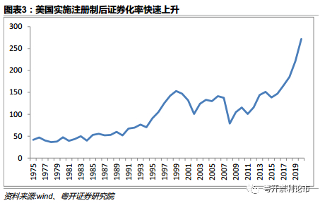美国在实施注册制以后,一直保持证券市场高效率运行,直接融资体系发达,证券化率整体不断提升,由1980年的47.5%上升到2020年的272%。