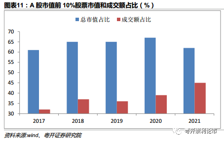 随着近年注册制逐步推进,退市规则逐步完善,我们看到近年A股资金对大市值股票更加青睐。通过统计近三年A股市值前10%股票年成交额占据总成交额比重来看,呈现逐年上升趋势,2019-2021年分别为36%、39%、45%,资金聚集程度明显增强。主要由于注册制实施下A股壳价值大幅降低,低价壳股炒作减少;另外退市新规对股票市值有明确规定,部分小市值股票退市风险加大。
