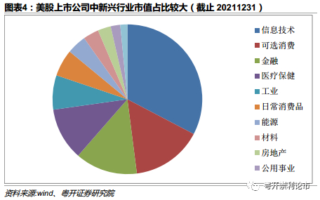 同时注册制下美国不断完善多层次资本市场,纳斯达克等板块对上市公司盈利水平限制放宽,对新兴产业支持力度较大,较好地促进了美国的历次经济发展转型。截止2021年底,美国上市公司中信息技术行业公司市值超过22.7万亿美元,占比超过32%,信息技术和可选消费行业市值占比接近50%,而房地产等传统行业占比不足10%。