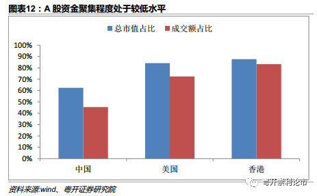 但是同美国和香港比较,A股资金聚集程度处于较低水平,随着未来全面注册制正式实施,相应退市规则将更加完善,A股上市公司数量大幅增加,上市公司质量分化加大,市场流动性分化将更加明显,A股资金聚集程度还有上升空间。