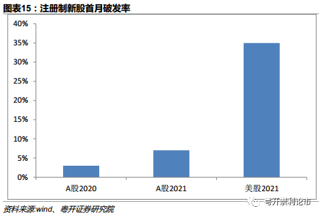 从破发率来看,询价新规实施之后A股破发率明显提升。2020年A股注册制新股首月破发率为3%,2021年这一数据上升到7%,较2020年增长一倍以上。但是同美股比较,A股破发率仍处于较低水平,2021年美股新股首月破发率超过了30%。随着全面注册制逐步实施,新股发行市场化水平逐步提升,未来A股破发率大概率将继续上行。