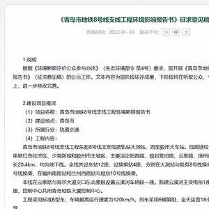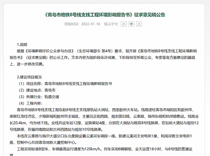 2022年1月10日,从青岛地铁官网获悉,地铁8号线支线环评公示正式发布,线路12座站点位置、线路总体走向也随之明确。