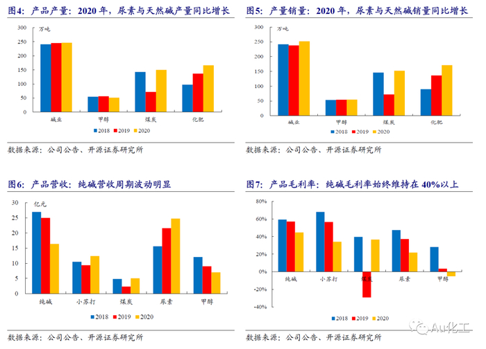 2018-2020年,公司营收主要来自于天然碱与煤化工板块。纯碱方面,2018-2020年,公司纯碱(自产)营收分别为26.93、24.99、16.39亿元,毛利率分别为59.58%、57.08%、44.68%。2018年以来,纯碱行业景气下行,公司纯碱营收同步下降,但公司天然碱法纯碱成本优势明显,纯碱毛利率始终维持在40%以上。小苏打方面,2018-2020年,公司小苏打(自产)营收分别为10.48、9.36、12.36亿元,毛利率分别为68.02%、56.62%、34.19%。2019年2月,公司40万吨/年精品小苏打项目投料试车。2020年,随着小苏打新产能释放,公司小苏打营收同比增长。但2020年小苏打价格同比下跌,公司小苏打毛利率下降。尿素方面,公司尿素(自产)营收分别为15.60、21.60、24.75亿元,毛利率分别为47.36%、37.19%、21.86%。2018年9月,公司年产30万吨合成氨、52万吨多用途尿素项目投料试车。随着项目产能逐渐释放,公司尿素营收持续增长。但在尿素价格持续下跌背景下,尿素毛利率逐渐下跌。