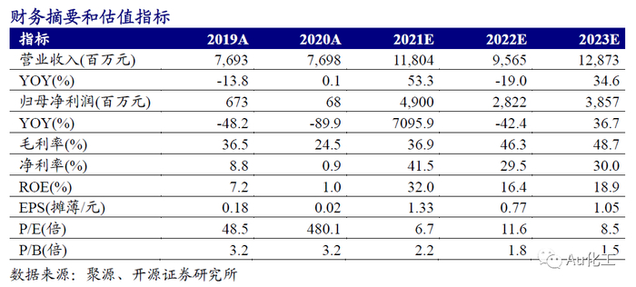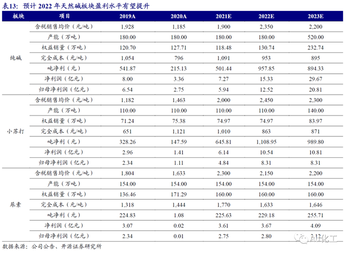 我们预计2022-2023年公司天然碱板块盈利有望显著提升。对此,我们做如下假设:(1)小苏打含税销售均价高于纯碱销售均价100元/吨;(2)2022年纯碱均价有望高于2021年。根据我们对纯碱行业的详细分析,随着光伏玻璃产能逐渐投产,2022年纯碱供给仍然偏紧。2021年纯碱价格前低后高,而2022年初纯碱出厂价仍维持在相对高位,预计2022年纯碱均价有望高于2021年;(3)2023年纯碱均价将高于2021年,低于2022年。公司将取得银根矿业60%的股权,实现对银根矿业的控制,天然碱产销率增长。塔木素天然碱项目一期预计于2023年上半年试生产,全年有望贡献新增纯碱产量170万吨、小苏打产量15万吨,对行业价格冲击有小幅冲击,但仍维持偏紧格局。(4)2022年及以后,煤炭供给紧张局面缓解,煤炭价格下滑,公司天然碱成本降低。基于以上假设,预计2021-2023年,公司纯碱归母净利润分别为5.94、12.52、20.81亿元。