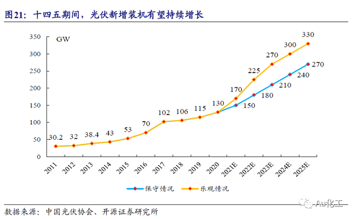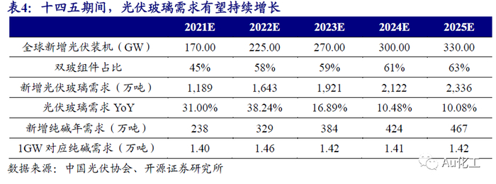 十四五期间光伏装机增速或大幅提升。根据新华网报道,2021年12月,中央召开经济工作会议,会议指出,实现碳达峰、碳中和是推动高质量发展的内在要求,要坚定不移推进,但不可能毕其功于一役。传统能源逐步退出要建立在新能源安全可靠的替代基础上。要立足以煤为主的基本国情,抓好煤炭清洁高效利用,增加新能源消纳能力,推动煤炭和新能源优化组合。要狠抓绿色低碳技术攻关。要科学考核,新增可再生能源和原料用能不纳入能源消费总量控制,创造条件尽早实现能耗“双控”向碳排放总量和强度“双控”转变,加快形成减污降碳的激励约束机制,防止简单层层分解。我们预计未来光伏产业链相关的上游原材料产能限制将大幅减少,制约光伏装机需求增长的因素或将不复存在。根据中国光伏协会数据,乐观情况下,预计2021-2025年光伏新增装机量分别为170、225、270、300、330GW,对应增速分别为30.77%、32.35%、20.00%、11.11%、10.00%。在碳达峰、碳中和的时代大背景下,我们预计2021-2025年光伏玻璃需求分别为1,189、1,643、1,921、2,122、2,336万吨,对应光伏玻璃需求增速分别为31.00%、38.24%、16.89%、10.48%、10.08%,拉动的纯碱需求分别有望达到238、329、384、424、467万吨。