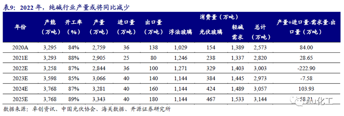 我们对纯碱行业供需表进行了详细的测算,预计2022年-2023年纯碱行业供给偏紧。假设如下:(1)产量:每年均参照历史的月度开工率,结合行业产能投产进度,对产量进行详细测算;(2)进口量:参考往年平均水平,2017年-2020年每年纯碱进口量在14-36万吨之间波动,2022-2025年,预计每年进口量为36-40万吨;(3)出口量:参考往年平均水平,2017年-2020年每年纯碱出口量在130-160万吨/年之间波动。随着未来海运费松动,全球经济复苏,预计2022-2025年纯碱出口量有望逐年回升,预计2022-2025年每年纯碱出口量为100-180万吨;(4)浮法玻璃:2021年召开的中央经济工作会议再次明确提出坚持以经济建设为中心,强调2022年经济工作要稳字当头、稳中求进,目前房地产政策融资环境进一步已回暖,考虑到2019-2020年新竣工面积基数较高,我们预计2022年房屋竣工有望实现同比小幅增长,带动浮法玻璃景气回暖;(5)光伏玻璃:我们按照中国光伏协会预计的十四五期间光伏新增装机情况,进一步测算光伏玻璃对纯碱的需求拉动。若考虑到光伏玻璃行业实际产能投产计划,实际光伏玻璃投产有望超预期;(6)轻碱需求:轻质纯碱对应终端需求主要为消费、食品、日化、冶金、味精等刚需行业,随着经济持续复苏,我们预计轻碱需求有望保持每年3%的小幅增速。