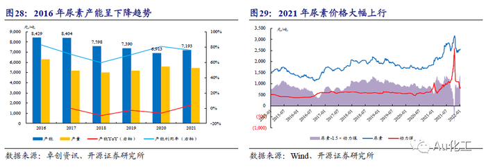 2016年以来,尿素产能持续下降。根据卓创资讯数据,2016年尿素行业产能为8,429万吨,而2021年尿素产能仅为7,193万吨,产能减少17.18%。2015年,农业部制定了《到2020年化肥使用量零增长行动方案》,随着供给侧改革推进,尿素落后产能不断淘汰,尿素产能持续下降。2020年下半年以来,煤炭供给始终偏紧,煤炭价格持续上涨,推高尿素成本。同时农产品价格高位,也进一步提高农民种植意愿,尿素需求进一步增长。在成本推动、供需共振下,尿素价格大幅上涨。在双碳背景下,未来尿素行业产能扩张或将愈发困难,我们预计未来尿素价格有望高位。