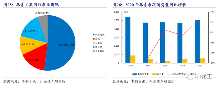 尿素主要用于农业用途。根据卓创资讯数据,2020年,52%的尿素用于农业用肥,15%用于生产复合肥,11%用于生产人造板,6%用于生产三聚氰胺。尿素主要用于农业用途,是一种主要的基础氮肥,同时部分尿素用于工业用途,如人造板、三聚氰胺等。2020年,尿素表观消费量为5,047万吨,同比+7.14%。2020年疫情席卷全球,随着各国采取大规模经济刺激政策,国际农产品价格自2020年下半年持续走高,农民种植意愿增强,尿素国内、外需求同比上涨。