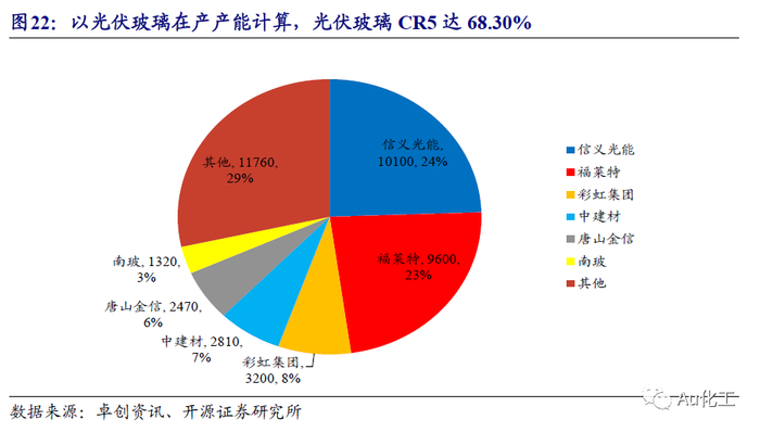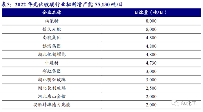 目前光伏玻璃行业集中度较高,光伏玻璃投产有望超预期。根据卓创资讯数据,截至2021年12月底,光伏压延玻璃在产日熔量为41,260吨/日。信义光能、福莱特、彩虹集团、中建材、唐山金信的光伏玻璃产能占比分别为24.48%、23.27%、7.76%、6.81%、5.99%,行业CR5高达68.30%。仅统计在建的光伏玻璃产能,2022年光伏玻璃行业合计拟新增产能55,130吨/日,为目前在产产能的一倍以上。在未来光伏新增装机高增背景下,光伏玻璃龙头为提前抢占市场份额,或加速扩产节奏,我们认为光伏玻璃投产节奏有望超预期。