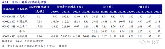 我们选取三友化工、云图控股、中盐化工等进行可比公司估值。对应2022年盈利预测,公司目前PE为11.59倍,考虑到公司成长空间较大,PE估值高于行业平均。但未来公司或将控股银根矿业,主导塔木素天然碱项目建设,我们坚定看好公司未来成长。若2023年银根矿业一期顺利投产,公司业绩与估值均有望提升。我们预测公司2021-2023年归母净利润分别为49.00、28.22、38.57亿元,EPS分别为1.33、0.77、1.05元/股,当前股价对应2021-2023年PE分别为6.7、11.6、8.5倍,首次覆盖给予“买入”评级。