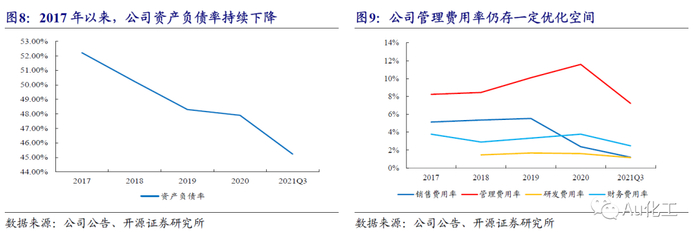 公司资产负债率显著下降,管理费用率存优化空间。截至2021年9月底,公司资产负债率为45.23%,较2017年底大幅下降6.99%。截至2021年9月底,公司销售费用率、管理费用率、研发费用率、财务费用率分别为1.19%、7.22%、1.15%、2.47%。公司此前子公司较多,管理费用相对较高。未来随着公司将煤炭、甲醇、乙二醇等资产剥离后,公司管理费用率有望进一步下降。
