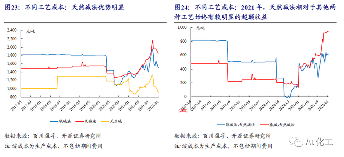 天然碱法成本优势明显。根据百川盈孚数据,截至2022年1月7日,联碱法、氨碱法、天然碱法工艺的生产成本分别为1,509.31、1,848.16、905.8元/吨。自2017年,天然碱法工艺的生产成本长期领先其他工艺,拥有较为明显的超额收益。
