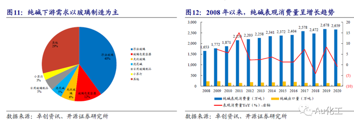 纯碱下游需求以玻璃生产为主。根据卓创资讯数据,2020年,40%纯碱用于生产浮法玻璃、6%用于光伏玻璃、12%用于生产玻璃包装容器、5%用于日用玻璃制品。其他应用领域包括焦亚硫酸钠、磷酸盐、洗涤剂、磷酸盐、白炭黑、氧化铝等。根据产品用途,可将纯碱分为重质纯碱和轻质纯碱。重质纯碱主要用于生产平板玻璃和光伏玻璃。轻质纯碱的下游应用较为分散,涵盖冶金、印染、制革、日化和食品等多个领域,包括生产生活洗涤剂、软水剂、味精、面食、冶炼助熔剂、选矿用助溶剂等。